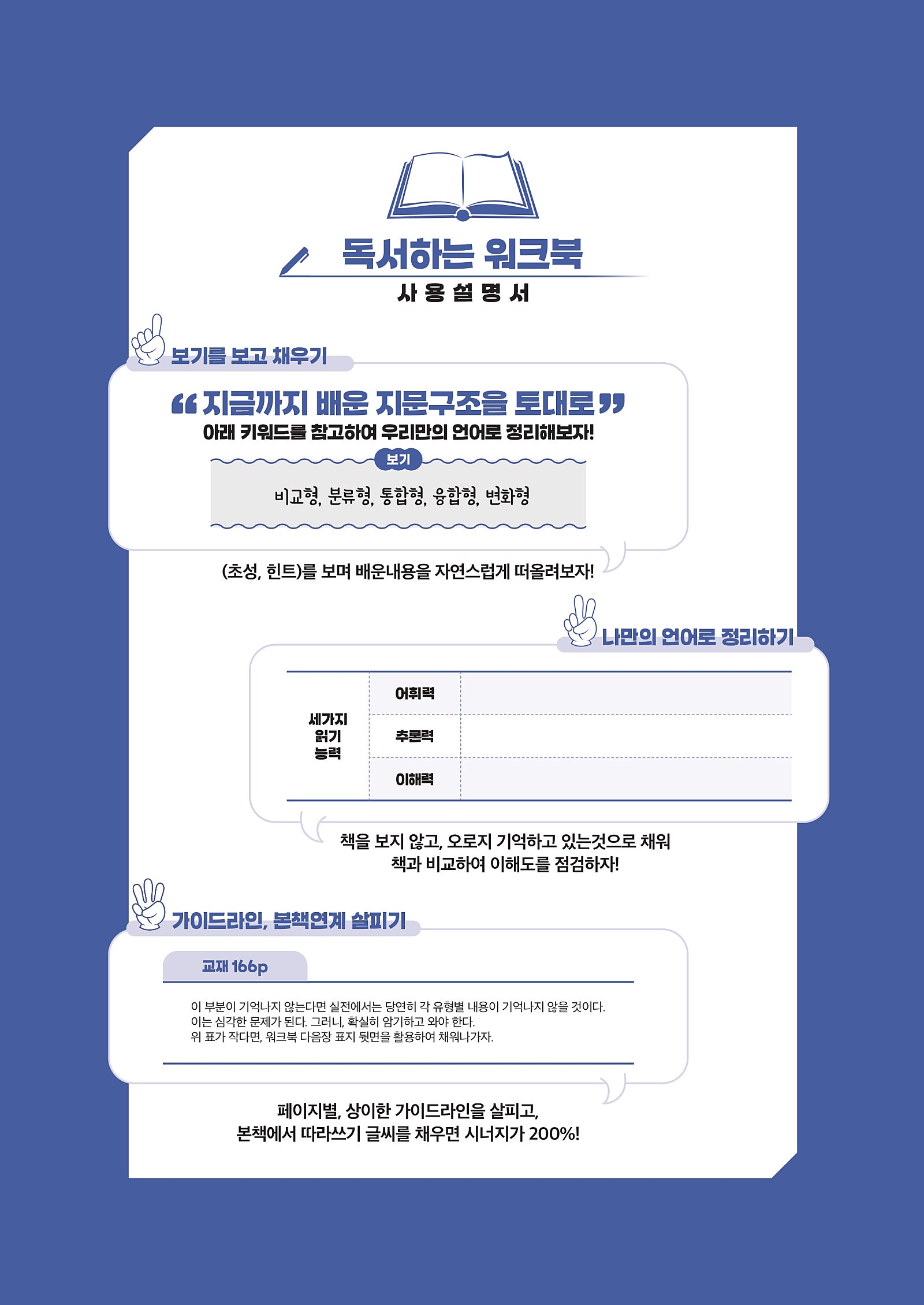 바로 1탄은 비문학 단권화 북스인데요~ 지문, 독해, 선택지, 문제풀이법을 초성과 말풍선 힌트에 맞추어, 채워나가는 자료입니다.
