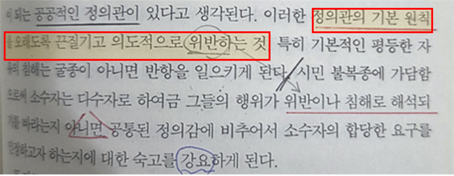 수능 제시문: 소수자는 다수자에게 그들의 행위가 정의의 원칙들에 대한 위반으로 해석되기를 바라는지
