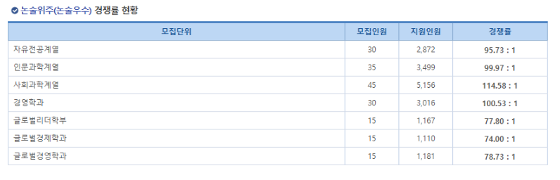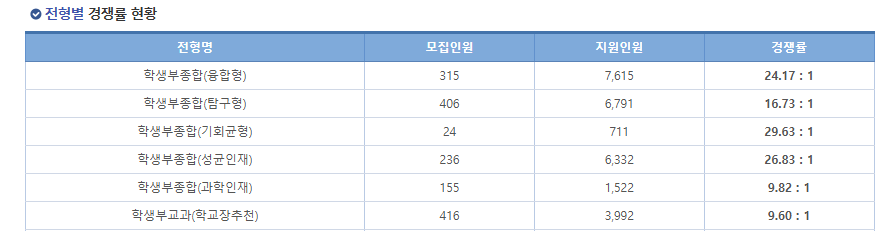 3합 5를 맞춰야 하는 글로벌 학과와 자전의 경우 실제 최저 충족률은 더 낮을 테니 어지간한 학과 기준 경쟁률이 25:1, 20:1 정도 나오는 것을 알 수 있습니다. 물론 아직까지도 굉장히 높은 경쟁률이긴 하죠. 그럼 나중에도 이렇게 될까요?
